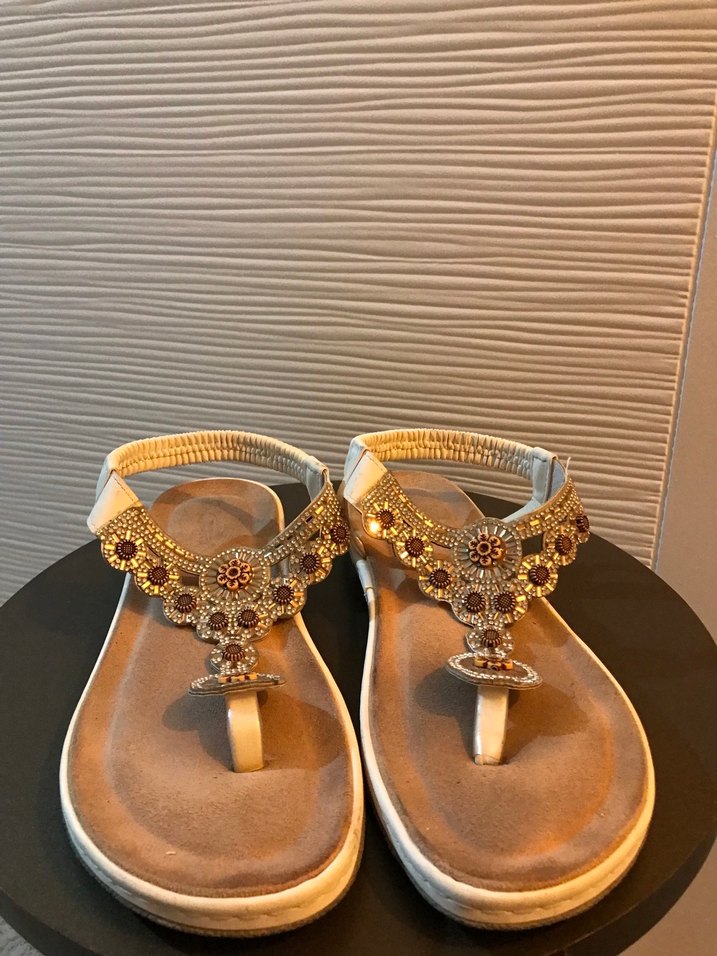 Nakışlı detaylara sahip altın renkli dolgu topuklu kadın sandaletleri, tokalı kayışlarla ve kauçuk malzemeden üretilmiştir. Parlak yüzeyiyle günlük kullanıma uygundur. ✨