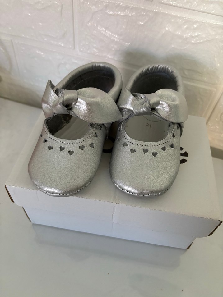 Metalik gümüş renkte hakiki deri yumuşacık ilk adım bebek patik ayakkabı 21 numara sıfır