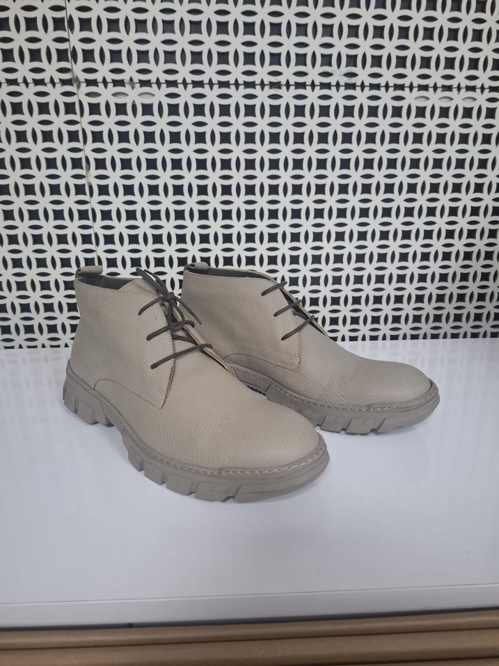 Krem tabanlı, dayanıklı kauçuk malzemeden yapılmış bej erkek botları. Günlük kullanım için şık ve desensiz tasarım sunar.