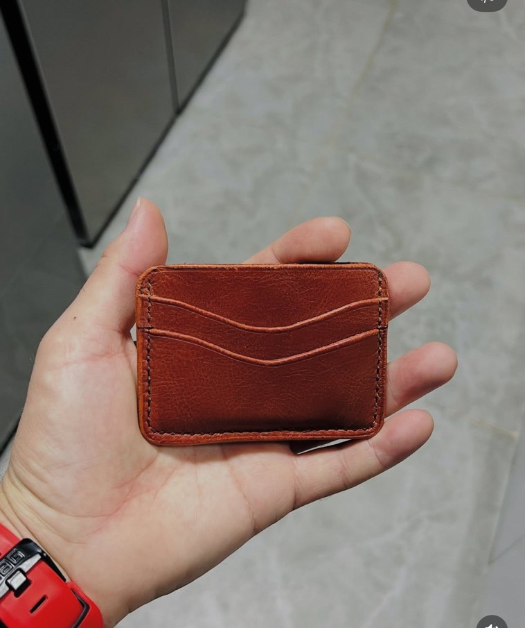 Hakiki deri el yapımı Koyu kahverengi minimalist erkek cüzdanı, kartlar için bölmeleri olan sade, desensiz tasarıma sahiptir. Kompakt boyutuyla elde rahatça taşınır.