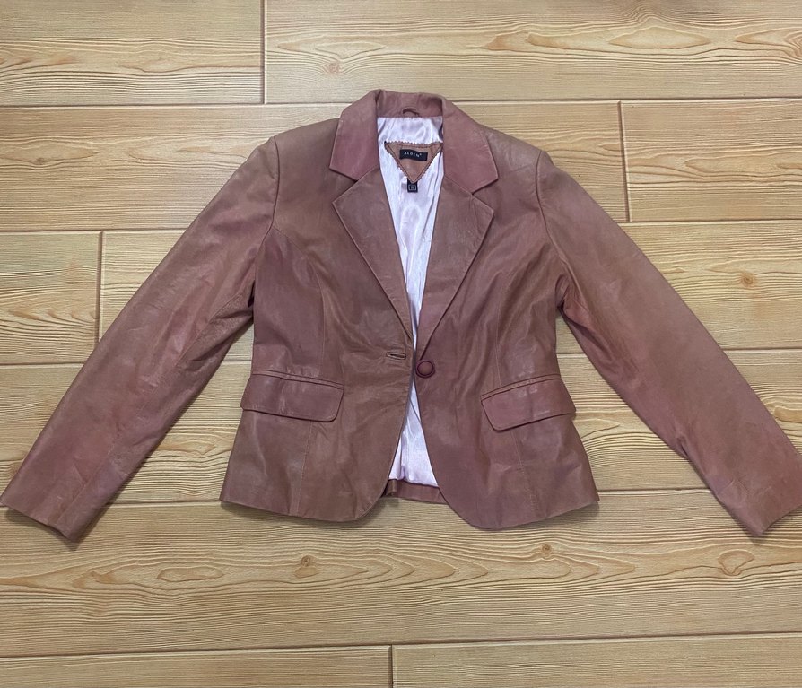 Düğmeli, hakiki deri kadın ceket, normal kesim ve uzun kolludur. Derisi hakiki kuzu derisidir.