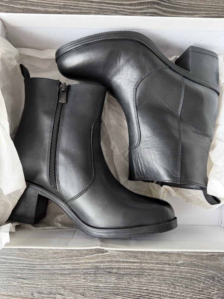 Siyah hakiki deri kadın botları, blok topuklu ve yan fermuarlı, günlük kullanıma uygun sade tasarıma sahiptir. Ölçüleri fotoğrafta mevcuttur, hiç giyilmedi sadece denendi, kutusunda gönderilecektir