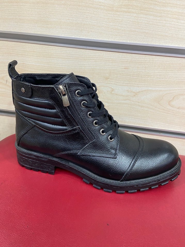 Siyah parlak biker tarzı erkek bot, bağcıklı, fermuarlı ve kemerli detaylı, kauçuk malzemeden, günlük rahat kullanım için uygun.