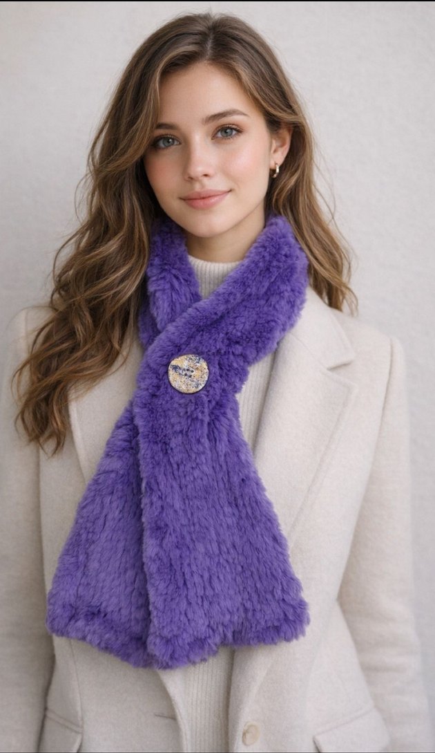 Hakiki deri kürk pastel mor renkte kadın atkısı, trend sokak stili için uygundur.