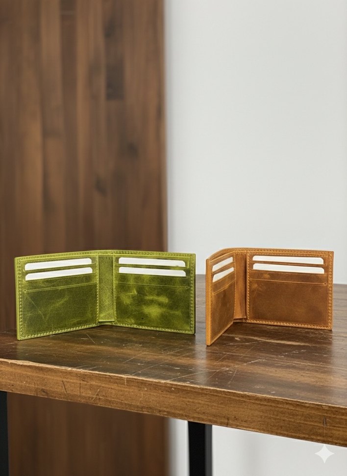 Parlak yeşil renkte, çoklu kart bölmeli ve sade tasarımlı minimalist erkek cüzdanı.