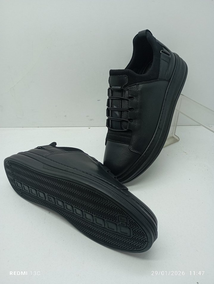 HAKİKİ DERİ Siyah renkli, kauçuk tabanlı erkek günlük spor ayakkabısı. Sokak stiline uygun, desen içermeyen şık ve rahat bir tasarıma sahiptir.