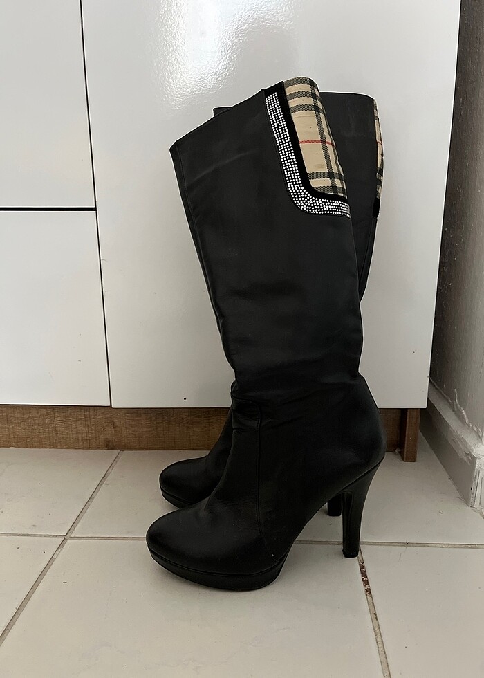 Burberry detaylı taşlı siyah yüksek topuklu içi sıcak tutar dışı hakiki deri şık çizme #burberry #kadınçizme #çizme #taşlı #şık