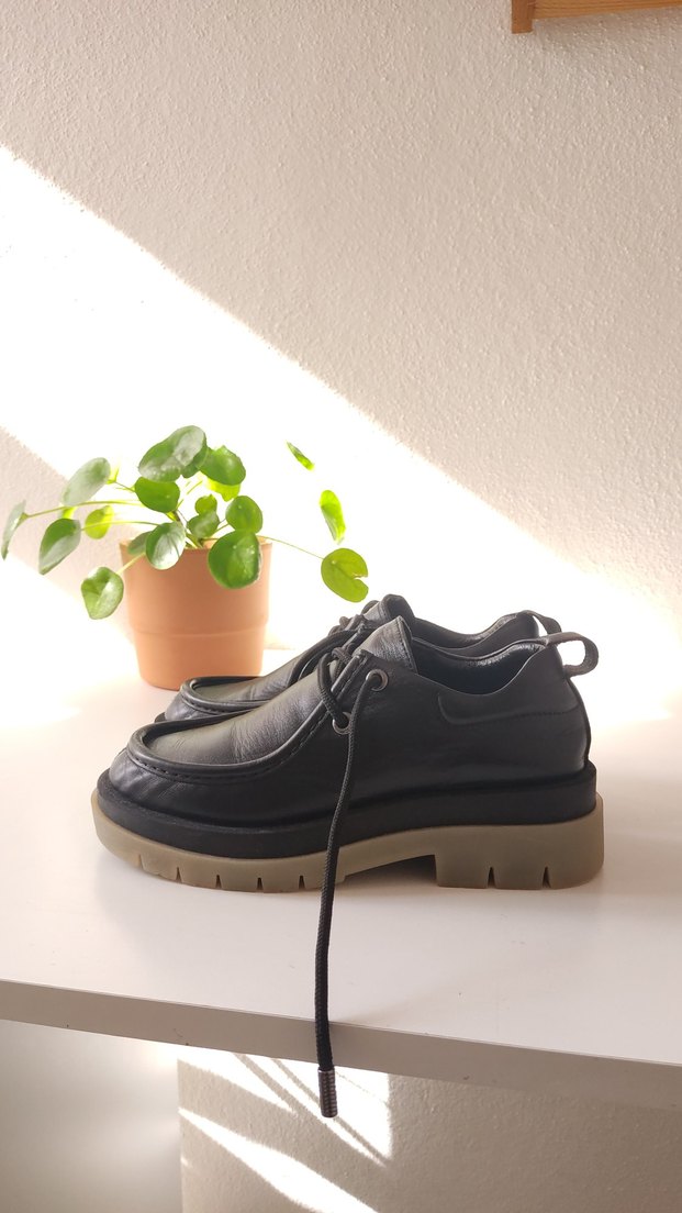 Miu miu derby benzeri. Gerçek deri, kalın tabanlı. Arka kısmı yastıklı gibi ve yumuşak. Dışarıda kullanılmadı, sadece ev içinde denendi.