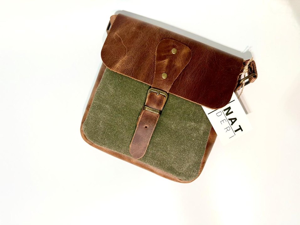 Kahverengi deri ve kumaştan, tokalı kapaklı çapraz çanta. Bohem tarzıyla günlük kullanıma uygun, desen içermeyen sokak stilini yansıtıyor.