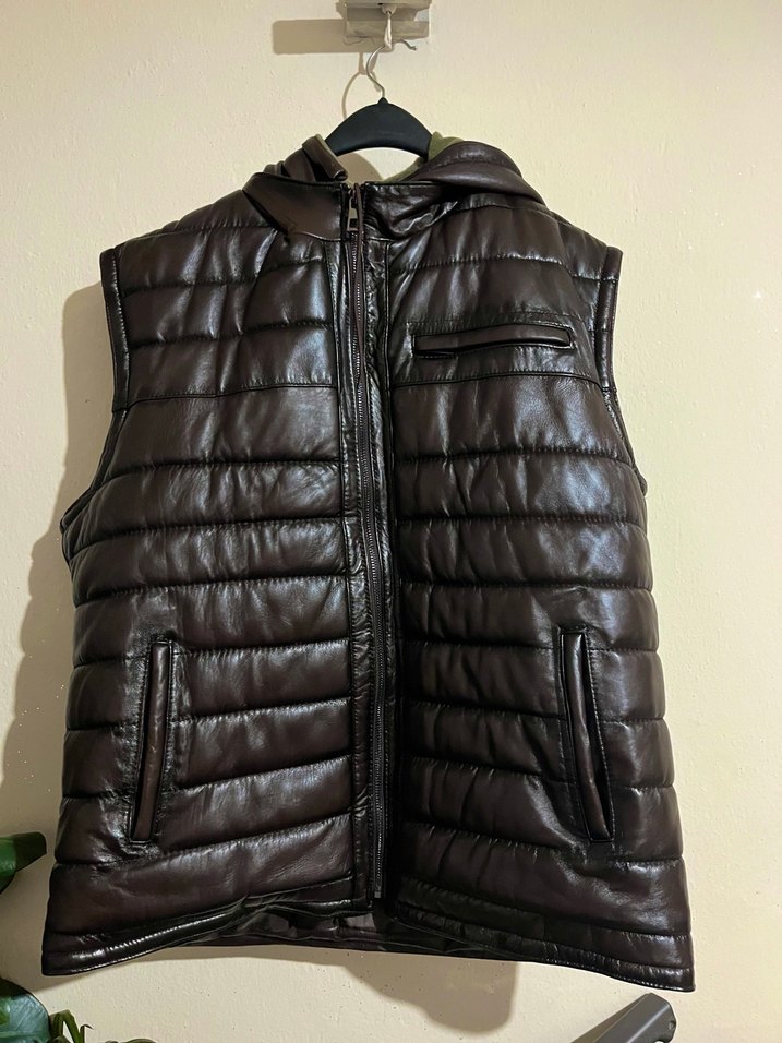 Kahverengi deri, kolsuz yelek, yakalı ve fermuarlı ceplidir. Günlük rahat sokak stili için uygun, orta uzunlukta ve vücuda oturan kesimdedir. Ürün hiç kullanılmadı ve hakiki deridir