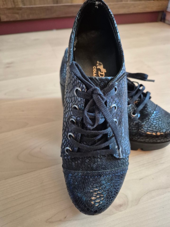Koyu lacivert , hakiki deri, yılan derisi desenli ve yüksek topuklu bağcıklı spor ayakkabı. Hiç kullanılmadı ancak içinde fotografta görüldüğü gibi bir soyulma mevcut. Gotik ve sokak stilini günlük kullanıma sunar.