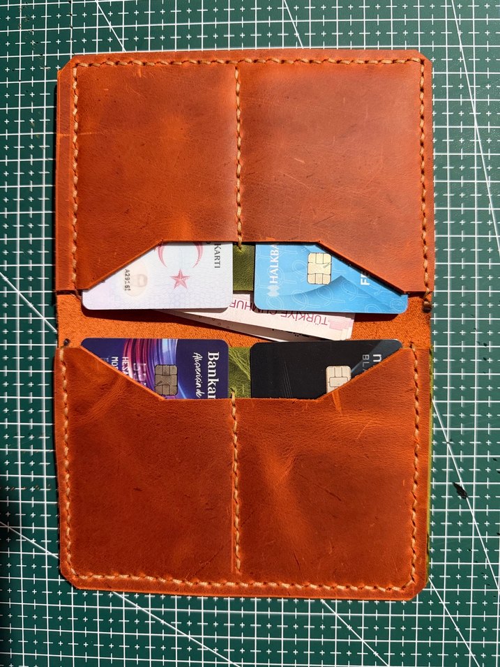 Ürün hakiki deriden el işçiliği ile üretilmiştir. Turuncu ve yeşil renkte deriler kullanılmıştır. Talebe göre farklı renklerde de yapılabilir. 4 adet kart 2 adet nakit bölmesi vardır.