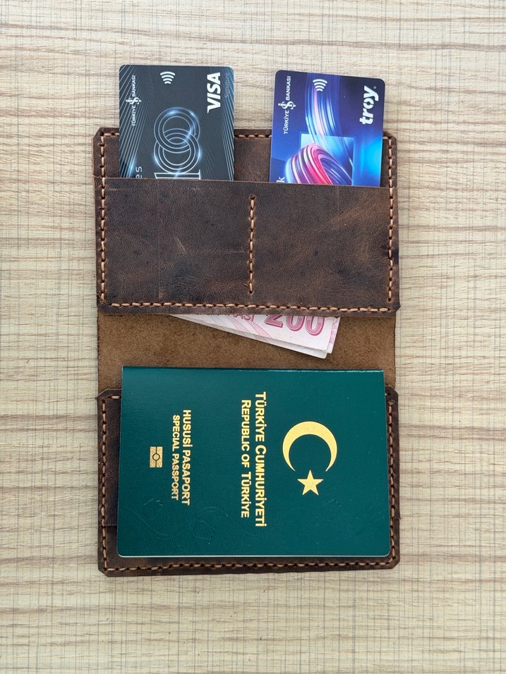 Hakiki deri malzemeden el işçiliği ile üretilmiş pasaport kılıfı / seyahat cüzdanı. İstenilen renk ve ebatlarda farklı renklerde de yapılabilir.
