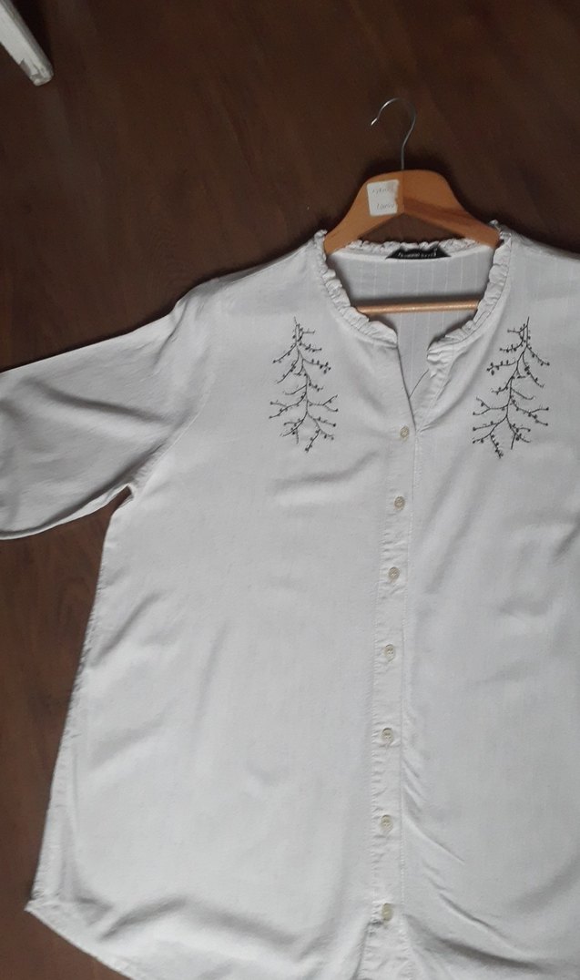 Pamuklu, kısa kollu, yakalı ve düğmeli beyaz kadın gömleği. Nakışlı dallar ve bol kesim ile bohem tarzda, günlük kullanıma uygundur.