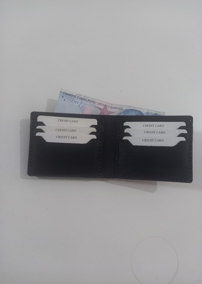 0 Deri cüzdan. Deri yüzeti yumuşaktır. Cepte rahatsızlık vermez. 6 adet kart bölmesi 1 adet para bölmesi bulunmaktadır.