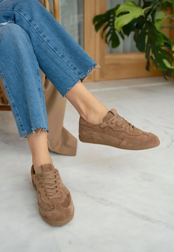 Bej süet kadın spor ayakkabısı, dolgu topuklu ve desen içermeyen tasarımıyla günlük sokak stiline şıklık katıyor.