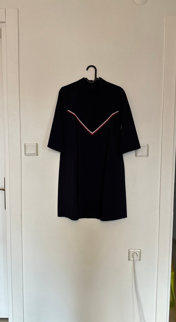 Lacivert midi elbise, hakim yaka ve kısa kollu. Sentetik kumaştan, rahat kesimli, günlük kullanım ve ofis için uygun. Boyu 85cm