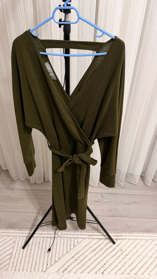 Hakki Yeşil uzun triko elbise, uzun kollu ve V yakalıdır. Kuşaklı bel detayı ve bol kesimiyle rahat bir kullanım sunar. Yumuşak ve sıcak dokulu kumaştandır. 1-2 kez giyildi temiz defosuz dolabımı yenilediğim için satıyorum