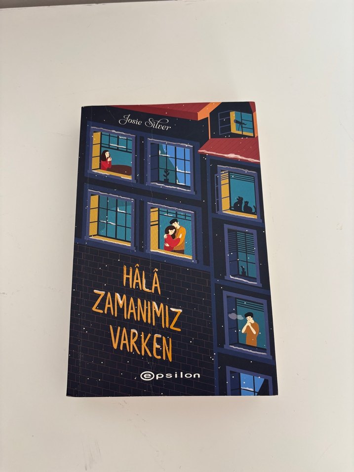 Josie Silver'in yazdığı 'Hâlâ Zamanımız Varken' adlı roman, kapakta çeşitli pencerelerde insanlar ve koyu mavi arka plan ile tasarlanmıştır. Epsilon yayınevinden.