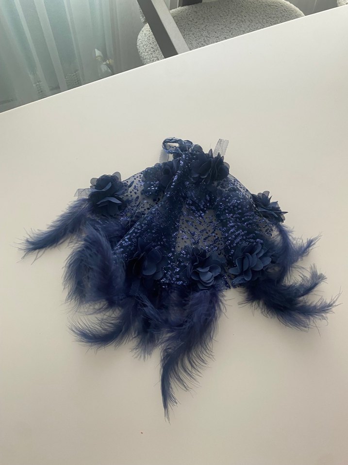 Koyu mavi renkte, nakışlı ve yumuşak kürk detaylı kadın broş, avant-garde tarz ve parti için uygun.