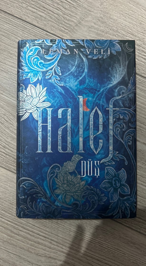 Aleman Veli'nin "Halef Düş" adlı romanı, çiçek desenleriyle süslenmiş mavi kapaklı bir kitaptır. Hikaye gizemli ve hayal gücü yüksek bir dünyada geçer.