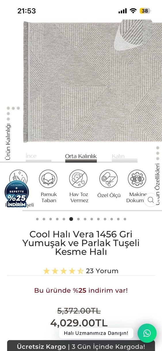 Cool halıdan alınmıştır vera serisidir bukle halıdır son görselde etiketi mevcuttur ürün kullanılmamaktadır görselde gözükmesi için serilmiştir en :80 cm boy :300 cm (3 metredir) yeni sorunsuz üründür gri renktir mutfakta koridorda her alanda kullanabilirsiniz leke kir tüy hav tutmaz robot süpürgeye uyumludur onun için püskülsüz özel tasarımdır