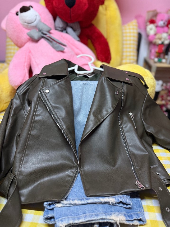 Koyu kahverengi, oturan kesim deri ceket, çıtçıtlı yakalı ve fermuarlı ceplidir, tokalı kayış detaylarıyla dikkat çeker.