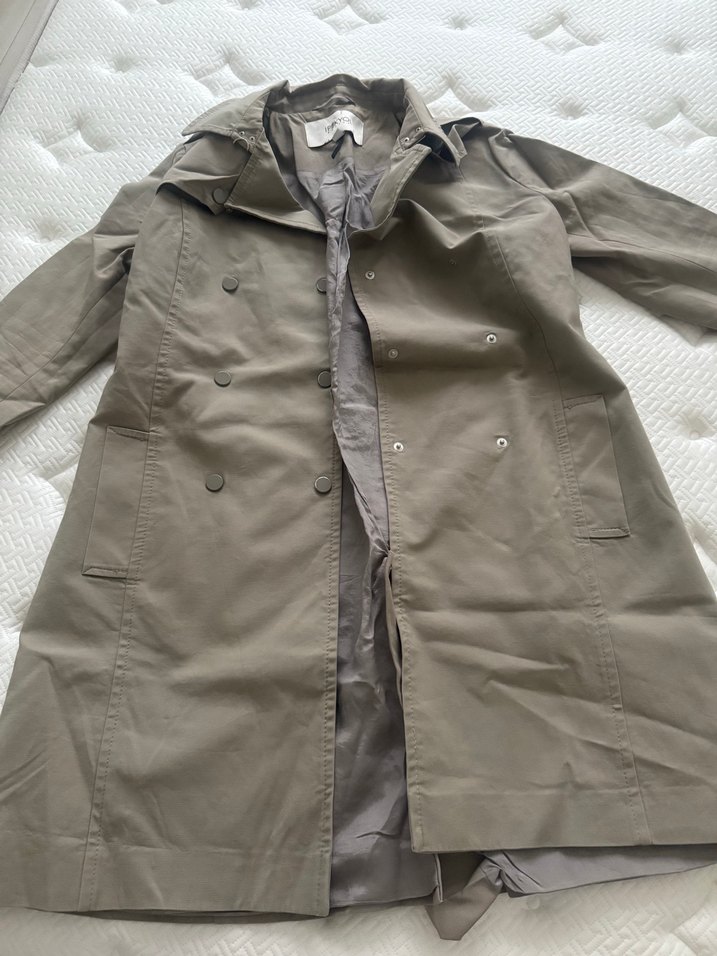 Düğmeli, kruvaze yaka ve uzun kollu, gri renkli, sentetik kumaştan yapılmış, kadınlar için midi uzunlukta dar kesim trençkot. ️