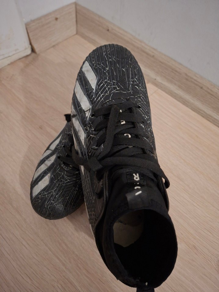 Siyah, bağcıklı civisiz halı saha ayakkabısı, temizdir