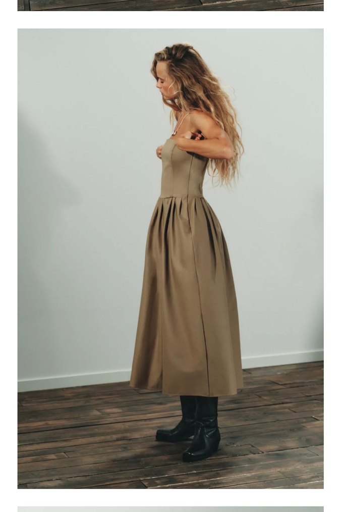 Askılı ve straplez kesime sahip haki uzun elbise, regular fit ve minimalist sokak stiliyle günlük şıklık sunar. Desensiz ve rahat bir tasarıma sahiptir.