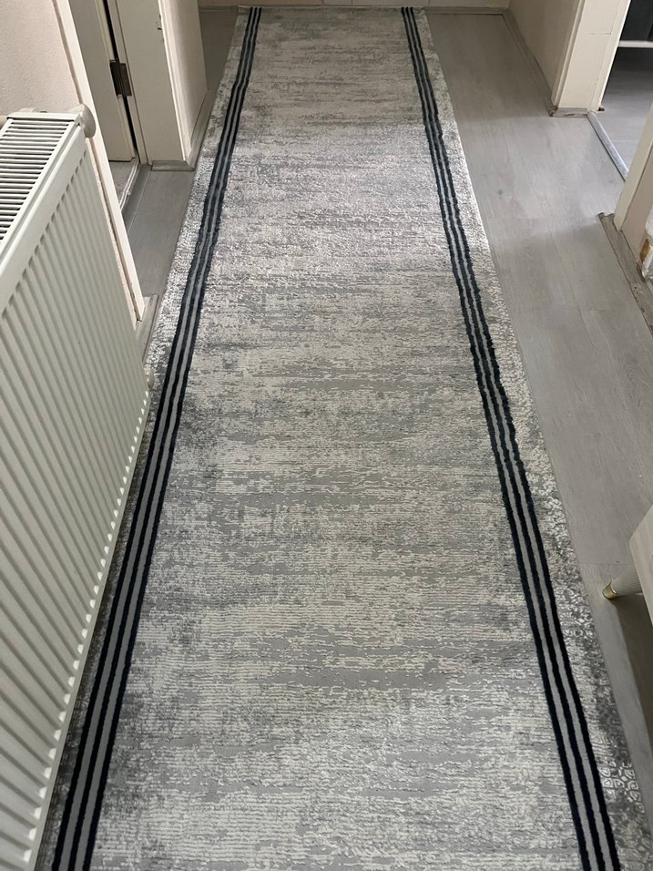 Gri tonlarında, kenarlarında ince çizgiler bulunan çağdaş tasarımlı enı 1 metre boyu 6 metre