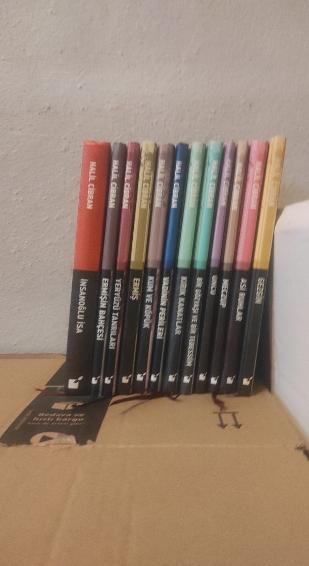 Halil Cibran'a ait 'Yeryüzü Tanrıları' ve 'İnsanoğlusa' gibi kitapların bulunduğu renkli kapaklı kitap seti.