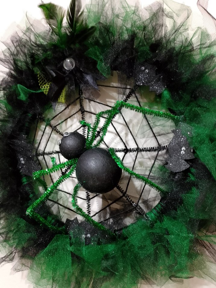 siyah örümcek ve yarasa detaylı koyu yeşil halloween temalı dekoratif kapı süsü. ️