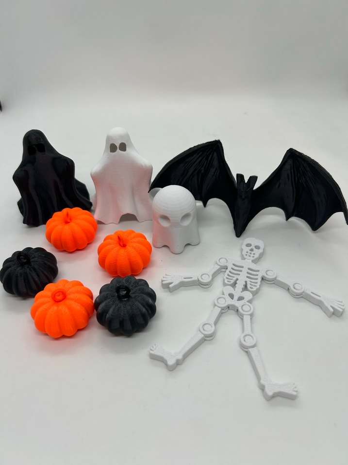 Küçük hayalet figürler, yarasalar, balkabağı ve iskelet içeren Halloween temalı set, koyu ve beyaz renklerle canlı turuncu balkabakları içerir.