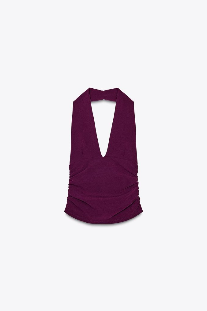 Elastik kumaştan üretilmiş üst. Halter yaka ve v yaka. Büzgü detaylı.