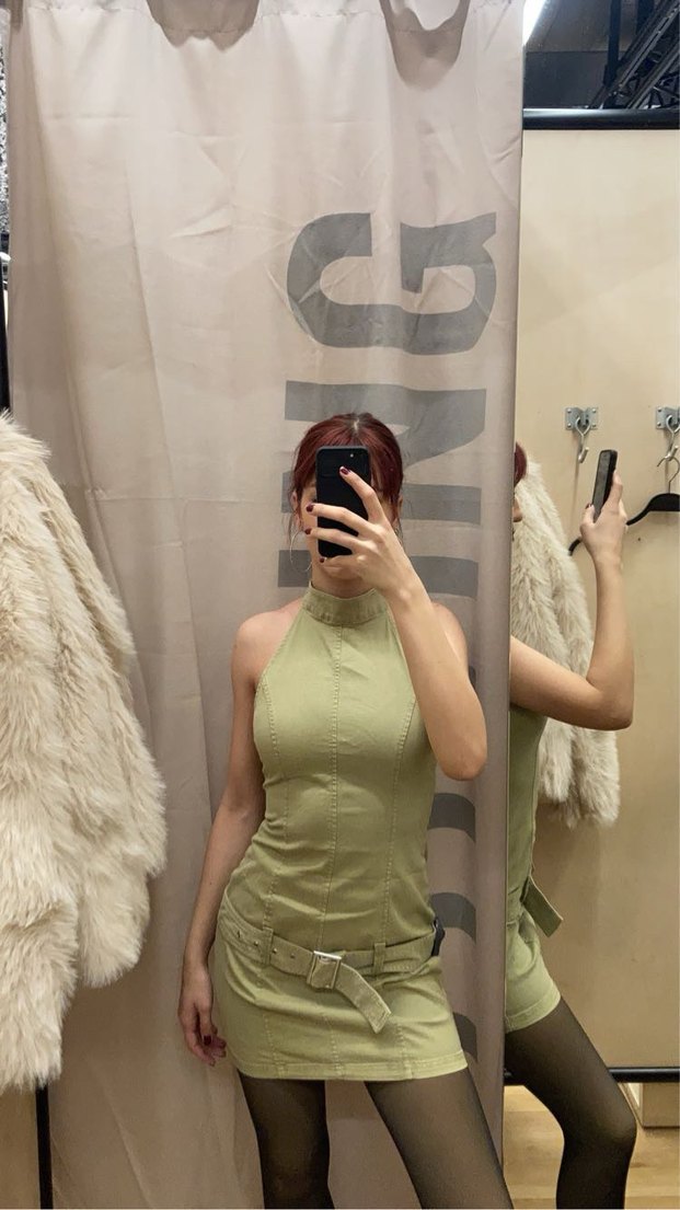 Düz renkli, haki tonunda, halter yaka ve kolsuz kısa elbise. İnce kesimi ve sentetik kumaşıyla minimalist ve şık bir görünüme sahiptir.
