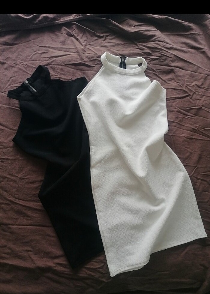 Siyah ve beyaz halter yaka mini elbise. Adet olarak fiyat verilmiştir. S-M beden için uygundur. 2li alımda 450TL olarak fiyatlandırılabilir.