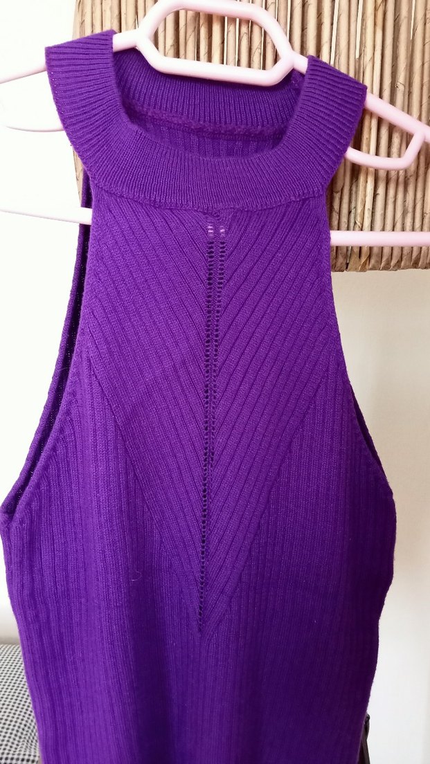 Mor renkli, kolsuz, yüksek yakalı ve normal midi boyda, düz desenli, vücuda oturan triko kazak. Minimalist ve normcore tarz için uygun.