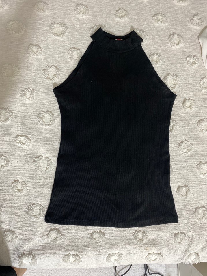 Çok az kullanıldı. Herhangi bir deformesi yoktur. Halter yaka, pamuklu, siyah bluz.