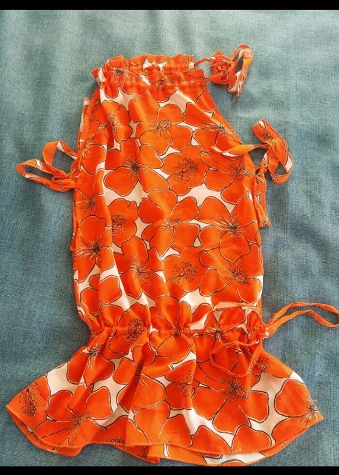 Turuncu çicek desenli halter yaka bel büzgü detaylı m beden tunik