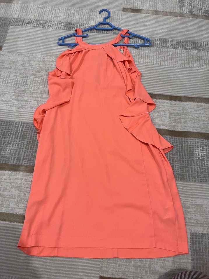 Halter yaka, volan detaylı, neon renkli elbise, bol kesim, parti için uygun.