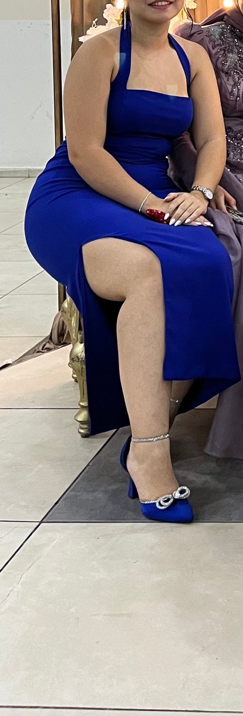 Halter yaka yırtmaçlı midi boy elbise