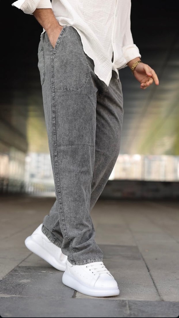 Gri renkli, regular fit kesim ve batik desenli denim pantolon. Günlük rahat kullanıma uygun, midi boyda ve şık bir model.
