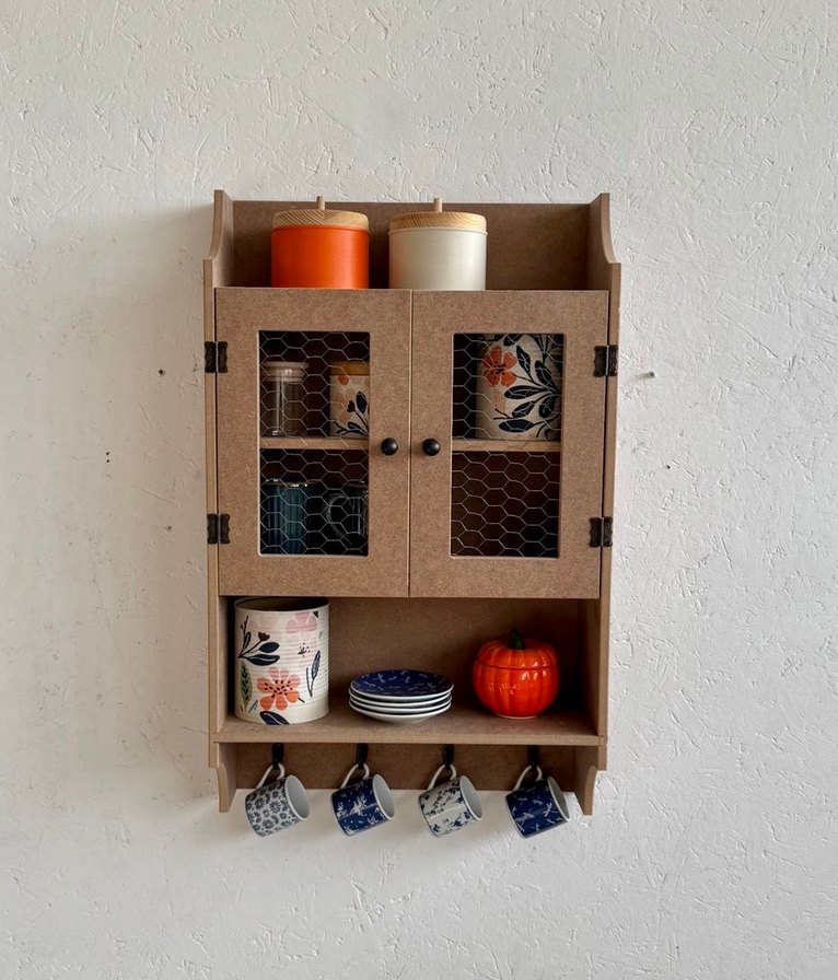 6İki tel kapaklı, açık raflı ve kupa asma kancalı kahverengi duvar rafı. Rustik ve kullanışlı saklama alanı sunar. ☕65.39.15 cm ölçüsünde mdf boyanabilir tel dolap, duvar dolabı, dört raf dört asma kancası bulunur.
