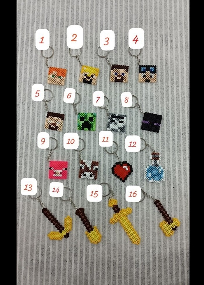 Hama boncuktan özel olarak tasarlanmış anahtarlıklar... Adet fiyatı:40₺ Numaralandırılmış fotodan istediğiniz modelleri seçip yeni bir ilan açtırın lütfen! Marka temsilidir.
