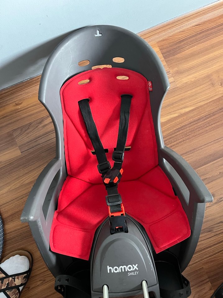 Hamax markalı kırmızı ve gri çocuk bisiklet koltuğu, güvenli emniyet kemerleri ile konforlu ve güvenli yolculuk sağlar.