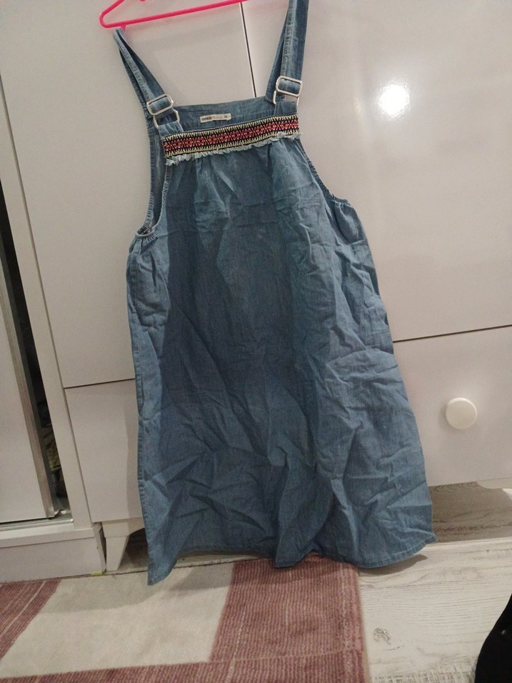 Mavi renkli, ayarlanabilir askılı, göğüs kısmında işlemeli detaylı, rahat ve yumuşak Hamile elbise