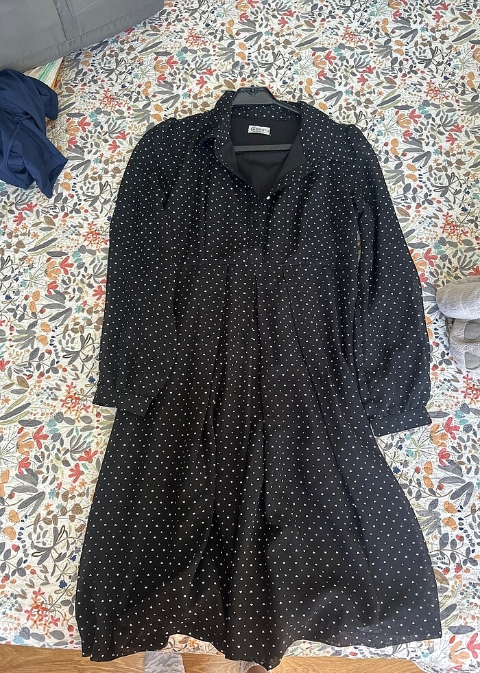 Tertemiz. Omuzdan uzunluk yaklaşık 96 cm. Kollar şifon. Astarlı,yandan femuarlı. Kemer yada kuşakla kullanılabilir