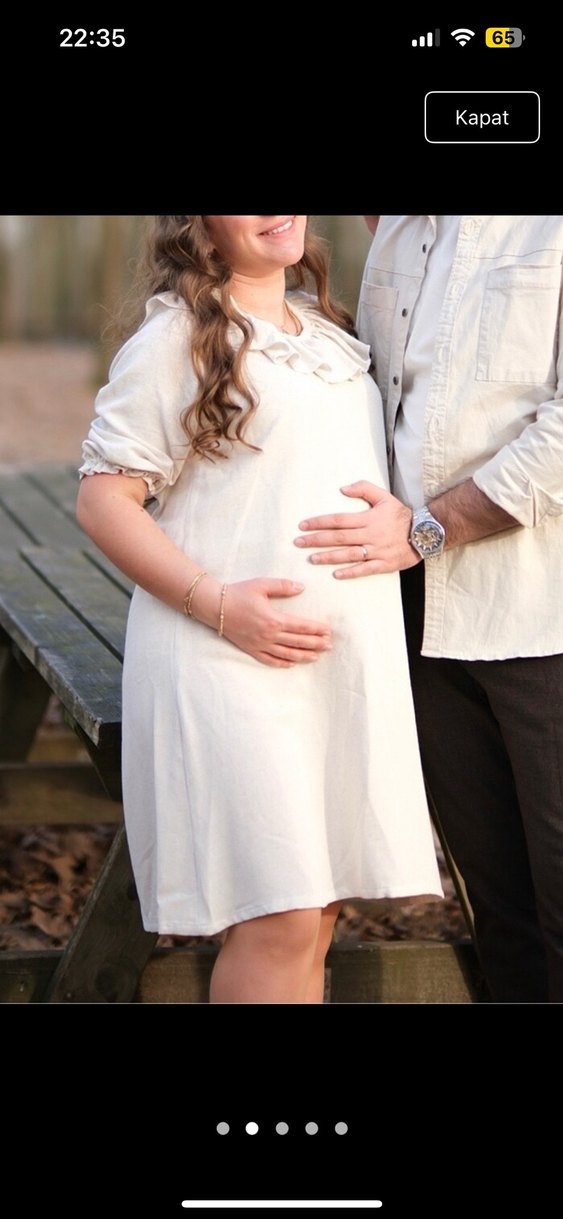 Bej renkte, bohem tarzda, desen içermeyen keten kumaştan yapılmıştır. Yaka kısmında fırfır detayı vardır. Hamile çekim elbisesi olarak 1 kez kullanıldı