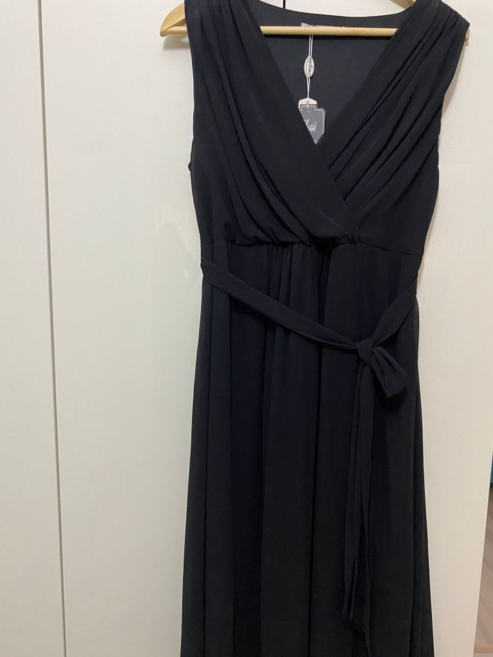 içi astarlı şifon Siyah elbise , drapeli V yakalı, kolsuz, uzun elbise. İnce ve şık dokusuyla minimalist gotik tarzı yansıtıyor. Ofis için uygun.3 beden 42